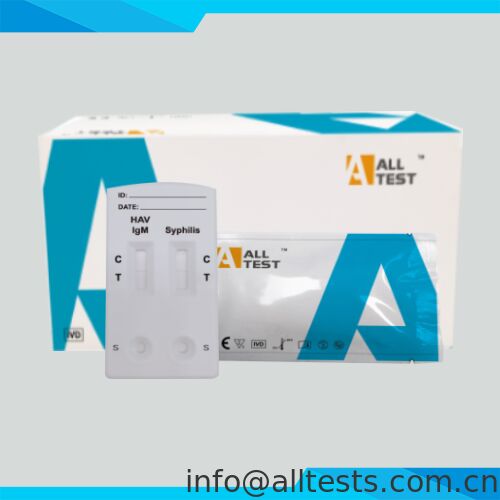 The HAV IgM&Syphilis Combo Rapid Test (Whole Blood/Serum/Plasma) is a rapid chromatographic immunoassay for the qualitative detection of IgM antibodies of Hepatitis A virus and antibodies of Treponema Pallidum (TP) in human whole blood, serum or plasma specimen to aid in the diagnosis of Syphilis and HAV infection.